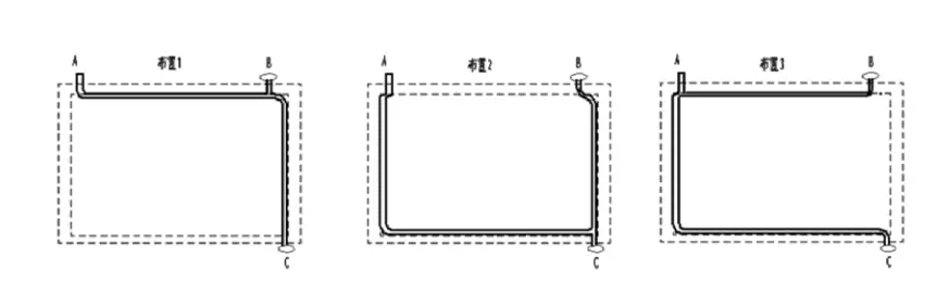 如下圖所示,圖中A是電源,它需要連接到用電器B和用電器C為用電器,圖中的三種方式都可以實現(xiàn)有效的連接。但是布置1明顯比布置2和3回路更短。