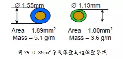 超薄壁導線PPE的應用是導線小型化的一個突破。通常來說,導線一般為PVC薄壁絕緣層(TW),其壁厚為0.4mm,新型超薄壁絕緣層(UTW),其壁厚為0.2mm,就拿0.35mm2導線為例,如圖29所示,超薄壁導線較薄壁導線減少了27%直徑,47%體積和30%多的重量,其輕量化效果明顯。