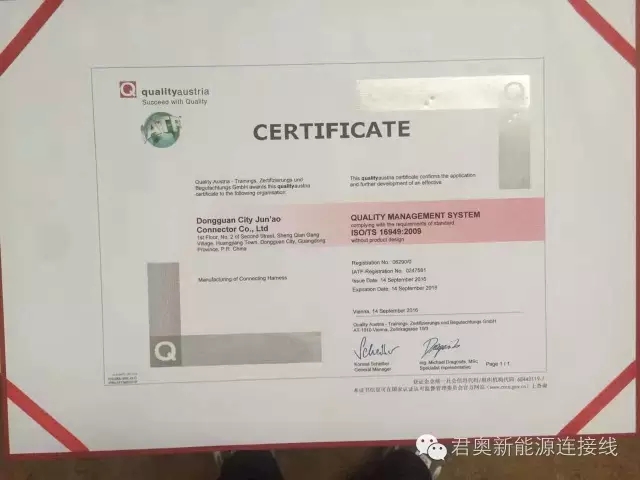 TS16949證書是我公司新能源汽車連接線給國內(nèi)整車制造商提供產(chǎn)品的必備條件,也是君奧新能源汽車連接線產(chǎn)品進入國際汽車市場的通行證,獲得此次審核的順利通過,為我公司的質(zhì)量體系持續(xù)改進及完善提供很多有效的方法,同時也標志著我公司的質(zhì)量管理水平有邁上了一個新的
