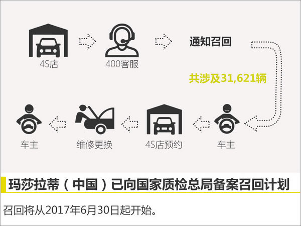 瑪莎拉蒂(中國(guó))汽車貿(mào)易有限公司已經(jīng)向國(guó)家質(zhì)檢總局缺陷產(chǎn)品管理中心備案召回計(jì)劃。據(jù)該公司統(tǒng)計(jì),中國(guó)大陸地區(qū)共涉及31,621輛,召回將從2017年6月30日起開始?,斏伲ㄖ袊?guó))汽車貿(mào)易有限公司將重新以掛號(hào)信等形式通知客戶。用戶可通過(guò)撥打瑪莎拉蒂咨詢服務(wù)熱線電話:400-688-5111,獲取此次召回的相關(guān)信息。