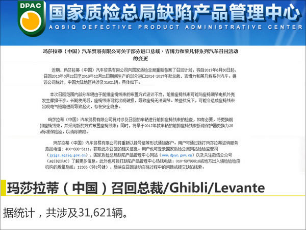 根據(jù)國(guó)家質(zhì)檢總局缺陷產(chǎn)品管理中心公布的消息,此次召回的車輛為2013年3月22日至2016年12月21日期間生產(chǎn)的部分進(jìn)口2014-2017年款總裁、Ghibli、Levante系列汽車。據(jù)該公司統(tǒng)計(jì),中國(guó)大陸地區(qū)共涉及31,621輛。具體如下:2013年3月22日至2016年12月15日期間生產(chǎn)的部分進(jìn)口2014-2017年款總裁系列汽車,共計(jì)11,815輛;2013年9月12日至2016年11月25日期間生產(chǎn)的部分進(jìn)口2014-2017年款Ghibli系列汽車,共計(jì)14,004輛;2016年5月12日至2016年12月21日期間生產(chǎn)的部分進(jìn)口2017年款Levante系列汽車,共計(jì)5,802輛。