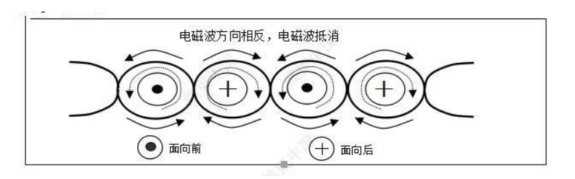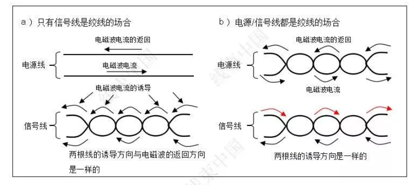 如果流過(guò)電磁波電流的電流線(xiàn)與信號(hào)線(xiàn)平行,那么不論哪根線(xiàn)都會(huì)產(chǎn)生同樣方向的誘導(dǎo)電流。但是,如果流過(guò)電磁波電流的電源線(xiàn)使用與信號(hào)線(xiàn)旋擰間距一樣的絞線(xiàn),就與信號(hào)線(xiàn)所產(chǎn)生的誘導(dǎo)電流是相反方向的。