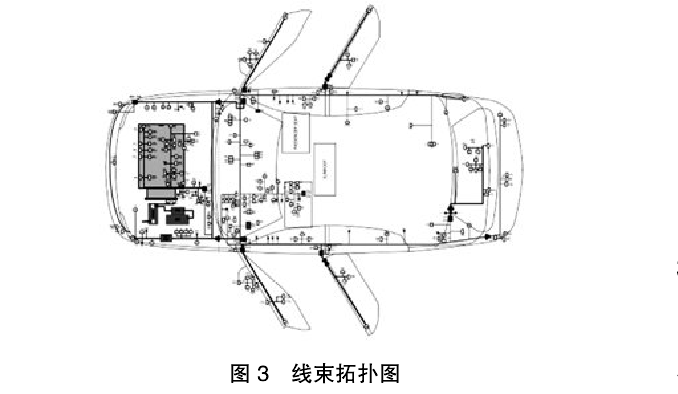 合理優(yōu)化的線束布置形式(圖2),決定著線束拓?fù)湫问?,確定線束合理分段設(shè)計,后期線束架構(gòu)、線束原理、線束工藝裝配性提升都起到了決定性作用。線束拓?fù)洌▓D3)分割的策略在項目初期要著重考慮,決定著總體的電器架構(gòu)、成本及擴(kuò)展性。在項目架構(gòu)研發(fā)階段,就要從線束總體的拓?fù)洳呗猿霭l(fā),對線束的關(guān)鍵點開展設(shè)計。