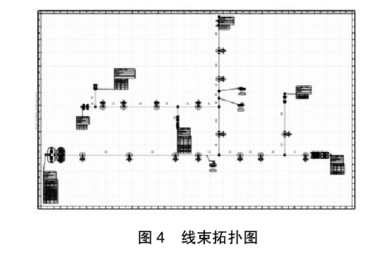 線束設(shè)計效率的提升取決于數(shù)據(jù)高效處理。通過CATIA的三維數(shù)據(jù),識別線束的拓?fù)浣Y(jié)構(gòu)、線長、接插件、卡扣、包扎材料等信息。生成線束圖紙,通過設(shè)計工具進(jìn)行運算處理。采用線束設(shè)計庫,自動導(dǎo)入原理接線,完成圖紙信息的生成(圖4)。