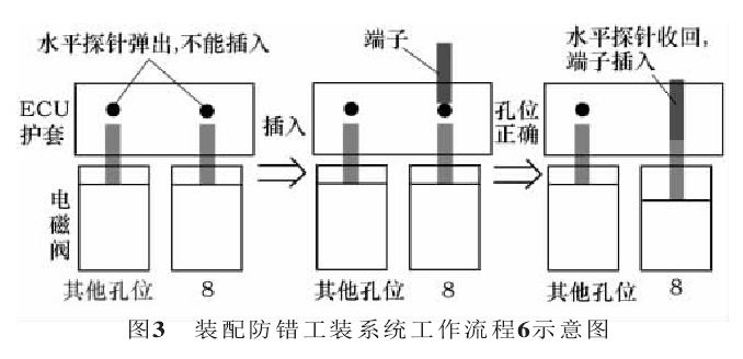 6)然后另一端再插氣囊ECU護套8 5孔位,端子在插入的時候首先碰到水平探針,檢測儀開始判斷是否插入正確:如果插入錯誤,普通護套防錯模塊下部探針與氣囊ECU護套水平彈性探針之間形不成電流同路,檢測儀不發(fā)出指令,電磁閥不工作,水平針不打開,該端子不能插入;如果插入正確,普通護套防錯模塊卜部探針與氣囊ECU護套水平彈性探針之間形成電流同路,檢測儀發(fā)出指令,電磁閥工作,水平針立即打開,端子插入。端子插入后接觸下面的垂直探針,普通護套防錯模塊卜部探針與氣囊ECU護套垂直探針之間形成電流同路,檢測儀判斷該線分裝完成如圖3所示