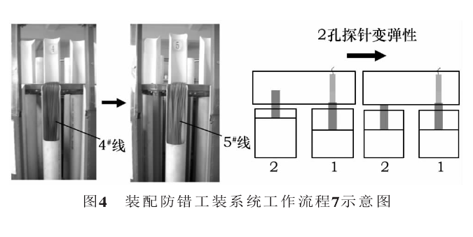 7 ) 4"線分裝完成后,檢測儀發(fā)出指令,步進電機工作,使取線防錯工裝臺轉(zhuǎn)到下一次5"線取線狀態(tài),檢測儀開始判斷下一根線,這時5"線穿入的普通護套2號孔位對應(yīng)的防錯模塊上的探針由剛性變?yōu)閺椥匀鐖D4所示