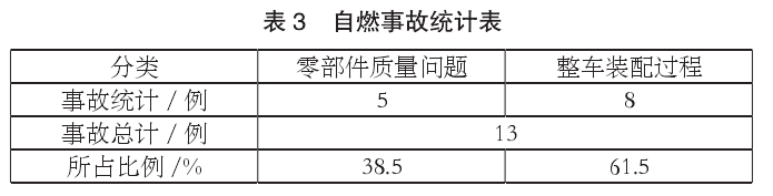 從表3可以看出,13例因制造問題導致的自燃事故中總裝裝配問題占比61.5%,主要為燃油管路錯裝以及線束錯裝,可歸納為油、電錯裝導致車輛自燃。因此規(guī)范裝配工藝、提高員工素養(yǎng)、加大質(zhì)檢力度可確保生產(chǎn)出的車輛質(zhì)量穩(wěn)定、可靠,降低車輛自燃幾率。關(guān)于錯裝問題,嚴格意義上講也可歸納為設(shè)計問題,汽車設(shè)計階段若融合防錯裝設(shè)計理念也可規(guī)避絕大部分錯裝問題,比如通過零部件的結(jié)構(gòu)設(shè)計使其只能按照正確的狀態(tài)進行裝配,若不按照正確的狀態(tài)進行裝配則無法進行裝配操作。當然從工藝上也可實現(xiàn)防錯設(shè)計,比如整個裝配工藝實現(xiàn)全自動化,完全采用機器人代替人工裝配,可大大提高裝配一致性及穩(wěn)定性。