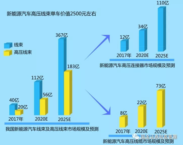 2017 年我國(guó)新能源車年產(chǎn)量79.4萬輛,線束市場(chǎng)40億,預(yù)計(jì)2020年產(chǎn)量達(dá)到225萬輛,市場(chǎng)達(dá)到112億,到2025年新能源車線束市場(chǎng)將可達(dá)367億。高壓線束單車價(jià)值2500元,2017年中國(guó)市場(chǎng)為20億元,推測(cè)2020年、2025年市場(chǎng)將達(dá)到56億元、183億元,全球市場(chǎng)同時(shí)期數(shù)據(jù)為44億元、124億元、418億元。